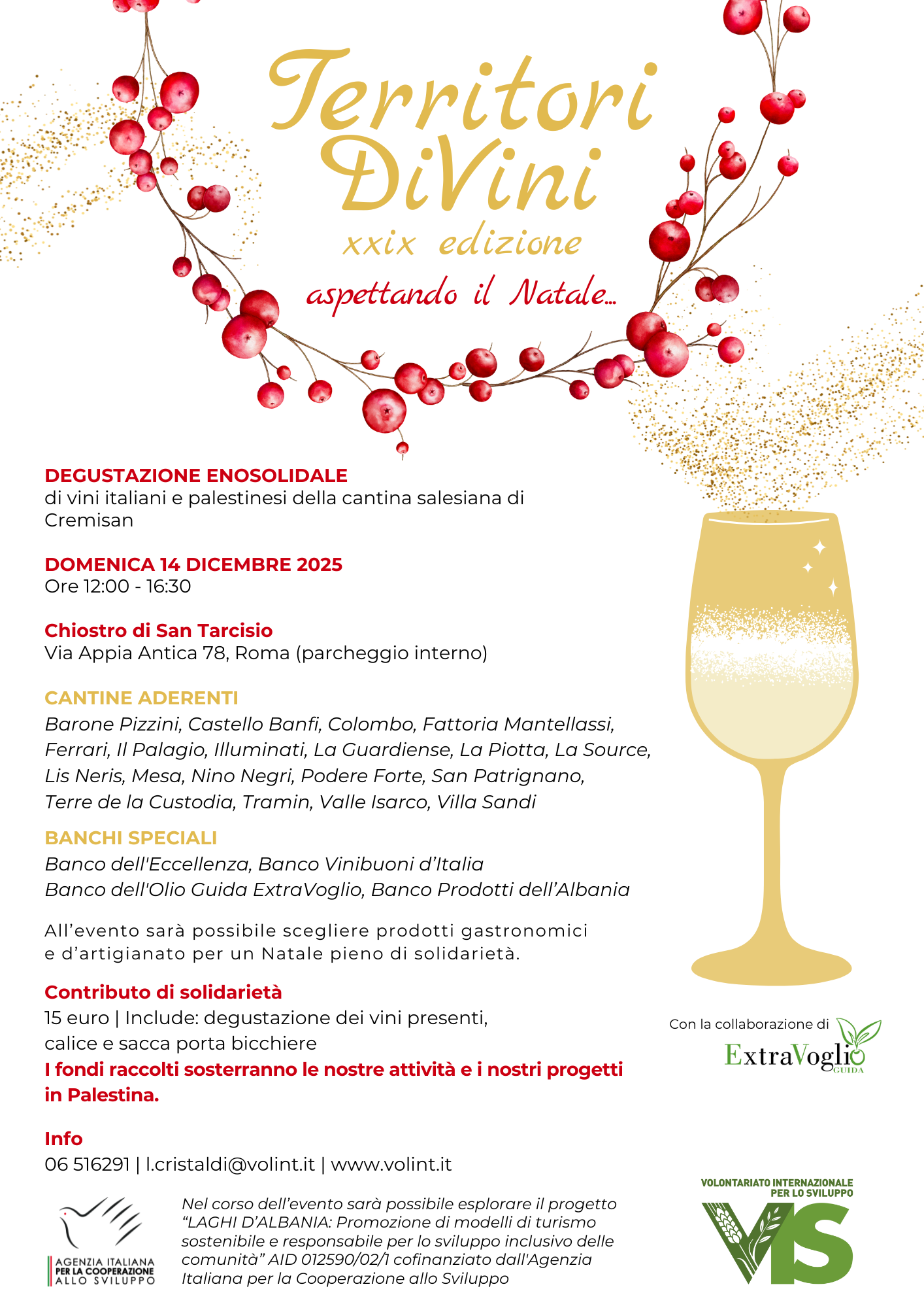 Domenica 14 dicembre torna il tradizionale appuntamento per gli amici del VIS appassionati di vino e solidarietà: “Territori DiVini", la nostra degustazione enosolidale giunta alla 29esima edizione. Ci ritroveremo dalle 12 alle 16:30 presso lo splendido Chiostro di San Tarcisio all’interno dello Parco delle Catacombe di San Callisto a Roma.